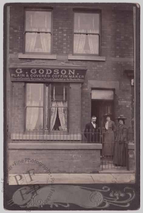 A trade directory for 1902 lists a George Godson 'undertaker' at 187 Gorton Road, Reddish, near Stockport [now in Greater Manchester]. A directory for 1910 lists the same man, now a 'coffin maker' at 557 Gorton Road, Reddish.